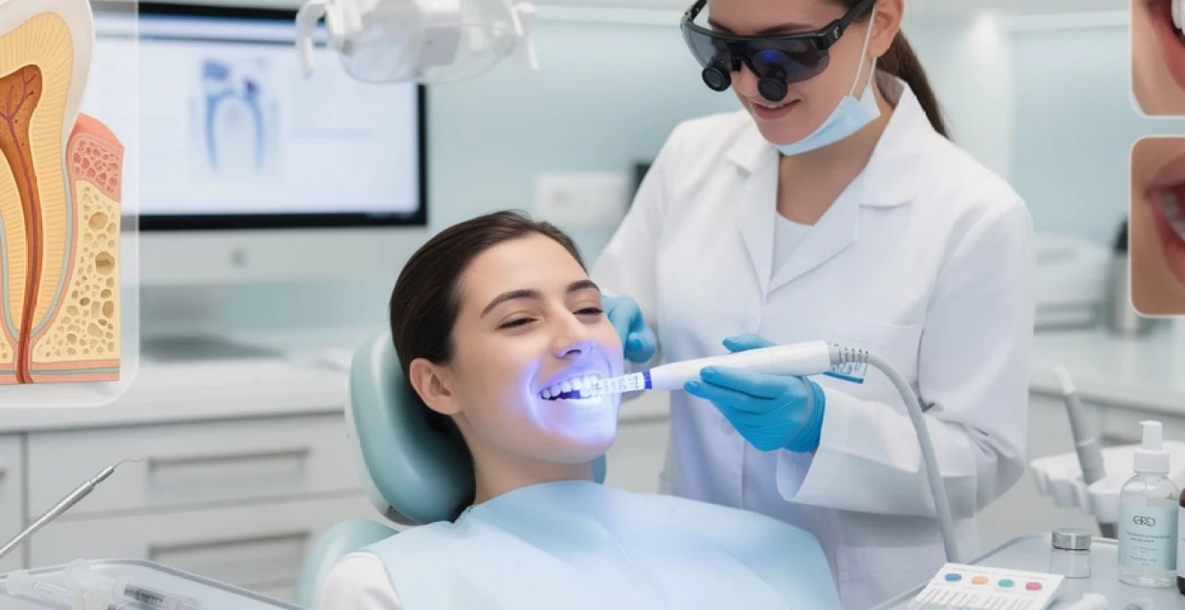Certains protocoles de blanchiment dentaire professionnel associent le peroxyde d’hydrogène à une activation photodynamique par lampe LED ou laser diode. L’objectif de ces dispositifs lumineux est d’accélérer la décomposition du peroxyde et l’activation des radicaux libres, réduisant ainsi le temps d’application nécessaire pour obtenir un éclaircissement comparable. Bien que le débat scientifique reste ouvert quant à la supériorité clinique de ces systèmes par rapport aux méthodes chimiques seules, ils offrent un confort appréciable pour le patient en raccourcissant la durée des séances au fauteuil.